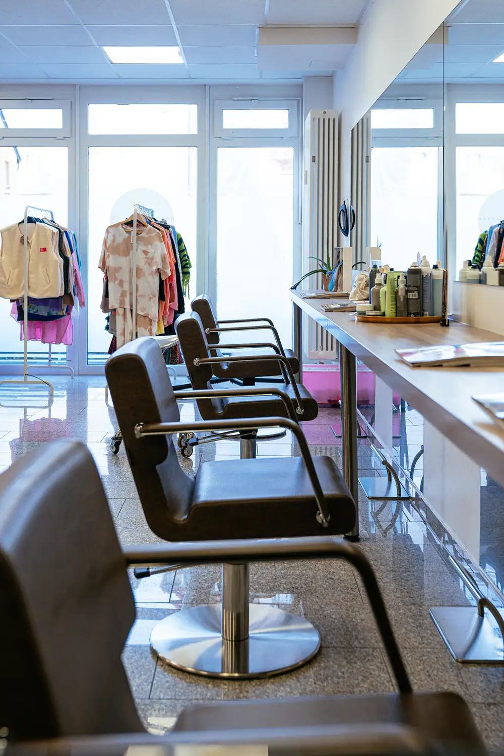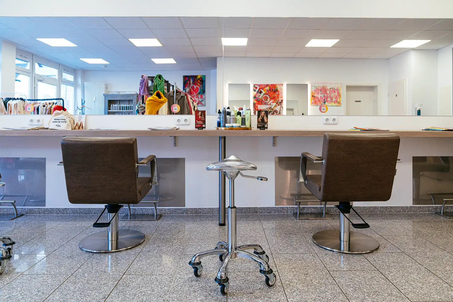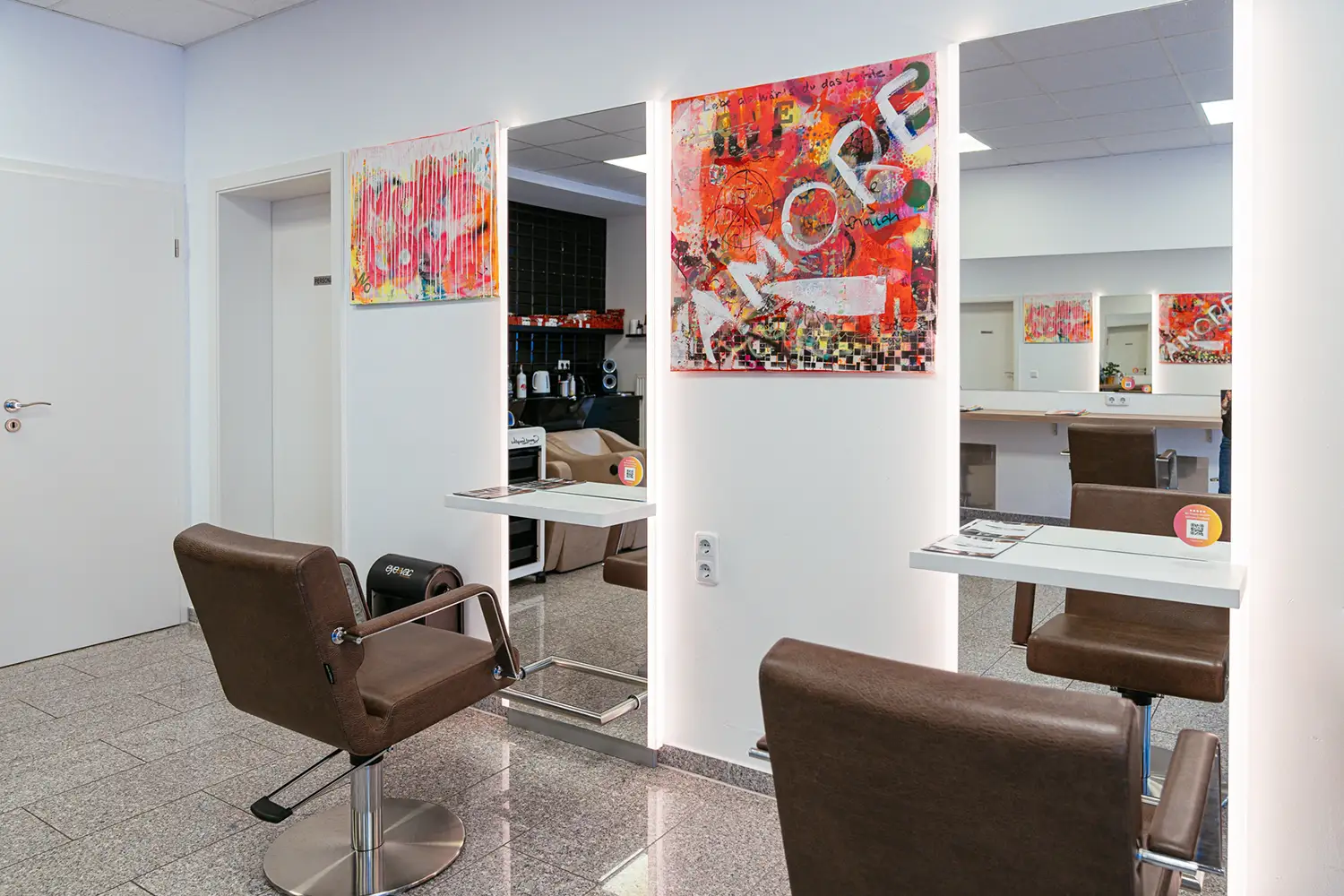 Marina ist brennt für ihren Job und das sollte sich im Brand wiederspiegeln. Sie liebt moderne Kunst und gestaltet sie auch selbst. Das sieht man auchvor Ort im Salon – Ihre Werke sind überall präsent.